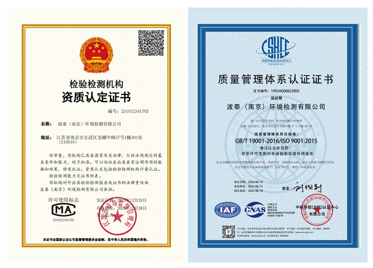 波泰(南京)环境检测有限公司注册于江苏南京。是一家专业从事电磁环境检测与评估、运营商基站检测、无线电监测系统检测验证、无线电大功率台站检测等无线电领域的技术检测、计量、认证服务的技术公司。公司技术力量、设备、设施和环境条件符合相关标准和规程的要求,是一家综合能力过硬的企业。